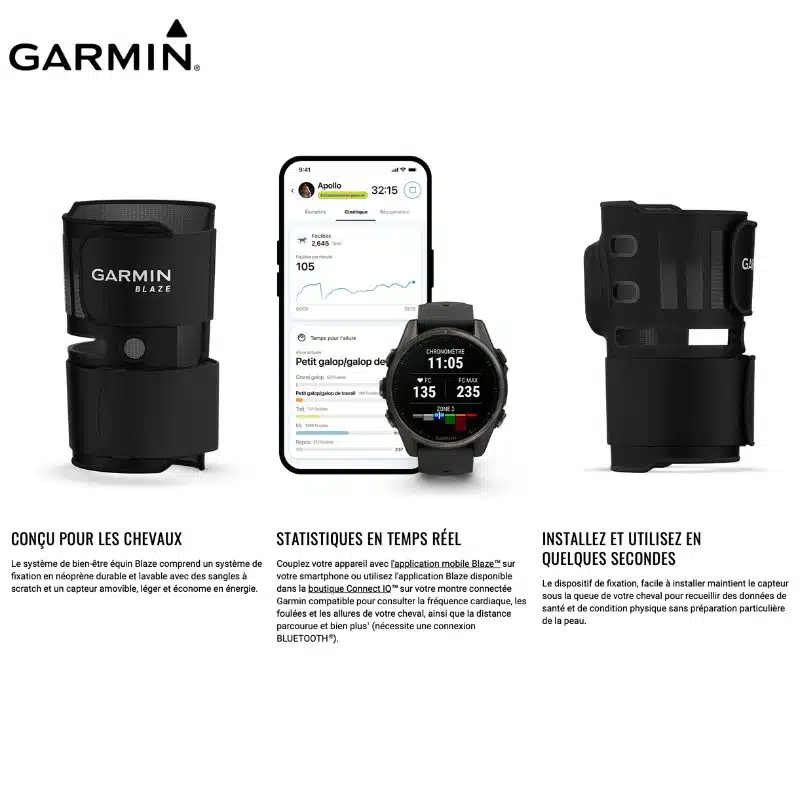 Le Système de santé et performance Garmin Blaze est un capteur innovant et facile à installer qui fournit en temps réel des données précieuses sur la santé, la condition physique et les performances de votre cheval.