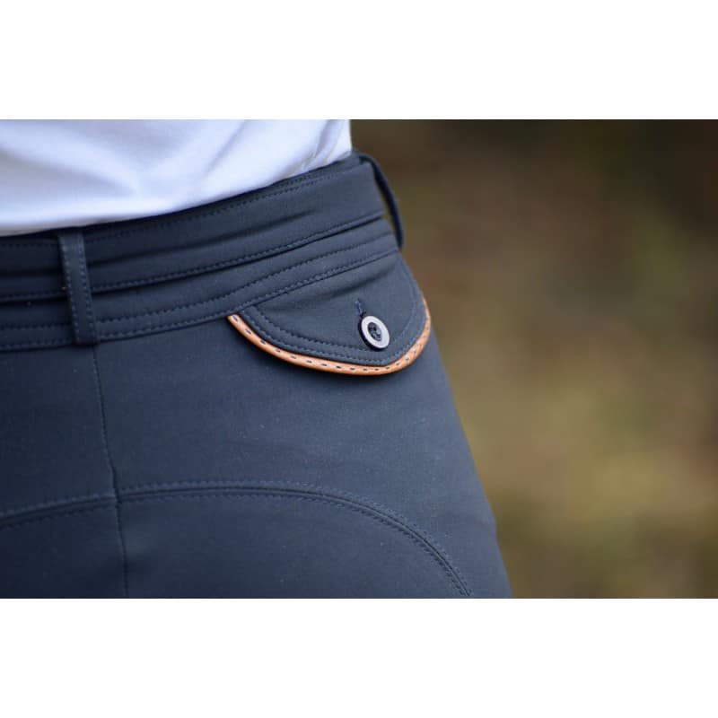 Pantalon d’équitation point sellier taille légèrement haute. Deux poches sur le devant et deux à l’arrière. Les 4, surmontées d’un point sellier. Sur-ceinture ton sur ton attachée par deux boutons. Antidérapant logoté à l’intérieur des genoux.