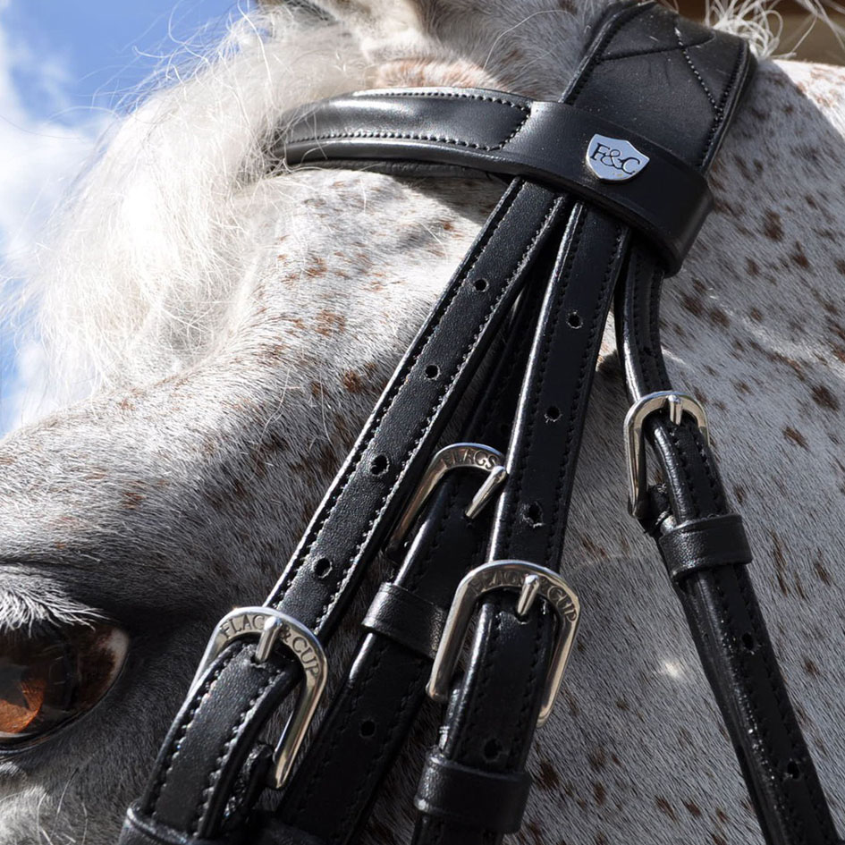 Frontal et muserolle pull back, larges, doublés et bombés 1/2 rond. Têtière anatomique, large, doublée et estampée F&C. Bouclerie inox gravée F&C. Livrée avec une paire de rênes lisses, et une paire de rênes hunter.