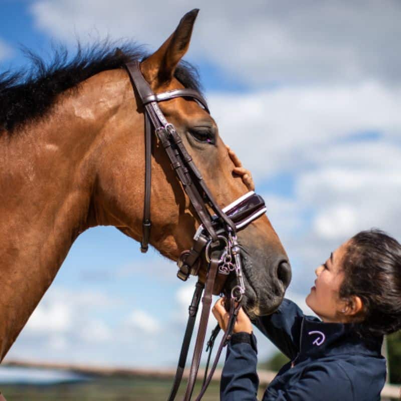 Elle possède un frontal souple en V et une muserolle souple et anatomique avec une fermeture pull back montée sur une patte de protection matelassée.