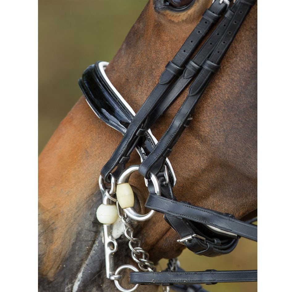 Livrée avec rênes cuir lisse, rênes de filet en cuir avec arrêtoirs. Coloris Noir/Blanc, en taille COB et FULL.