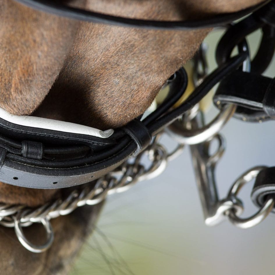 – Muserolle “pull-back” de 3 cm avec découpe anatomique, laquée, rembourrée et doublée de cuir souple
