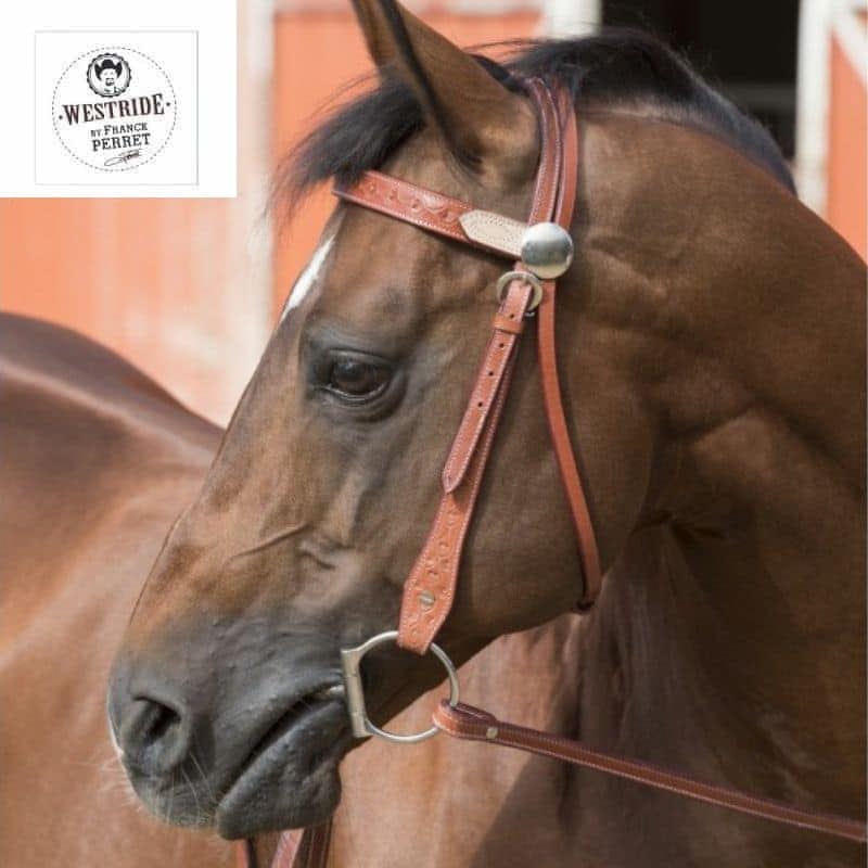 Le Bridon Two Tone Westride est un bridon western en cuir de buffle estampé motif plumes et surpiqûres blanches.