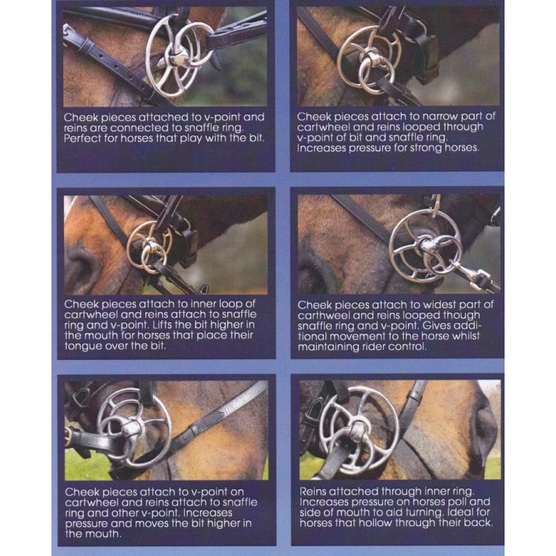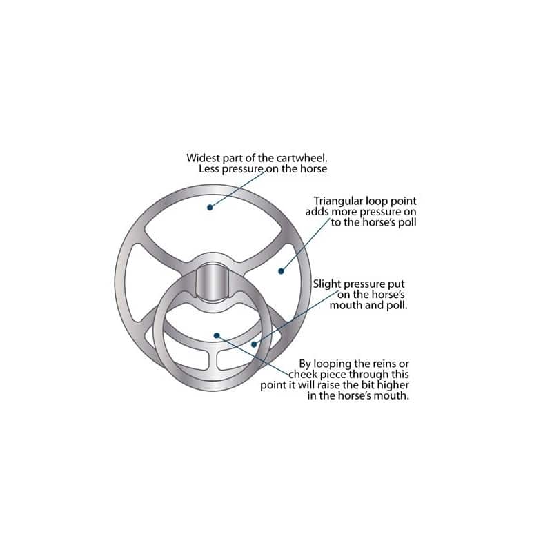 Ce mors en acier inoxydable composé de canons simple brisure de forme anatomique, petits anneaux Ø 40 mm, 2 grands anneaux Ø 80 mm mobiles façon “rondelles” étudiés pour proposer différentes options de fixation donc d’actions (légèreté, souplesse, douceur, pression répartie, contrôle…).