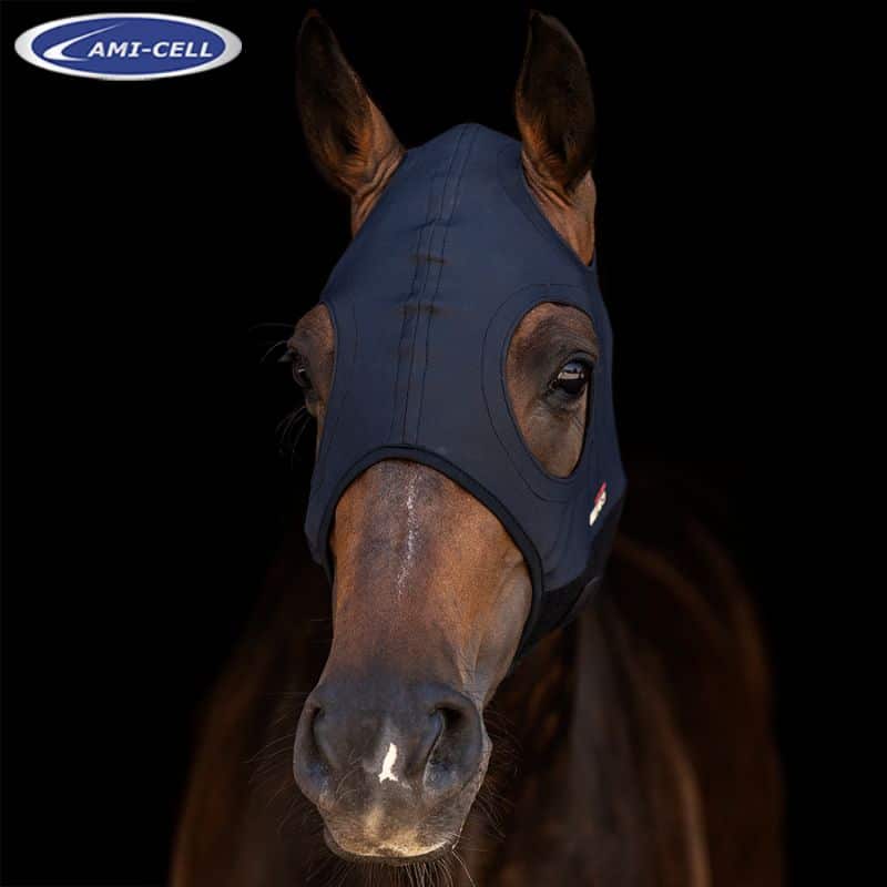 Le masque est en tissu extensible de titane permettant de diminuer la nervosité du cheval pendant la compétition et améliorer sa performance.