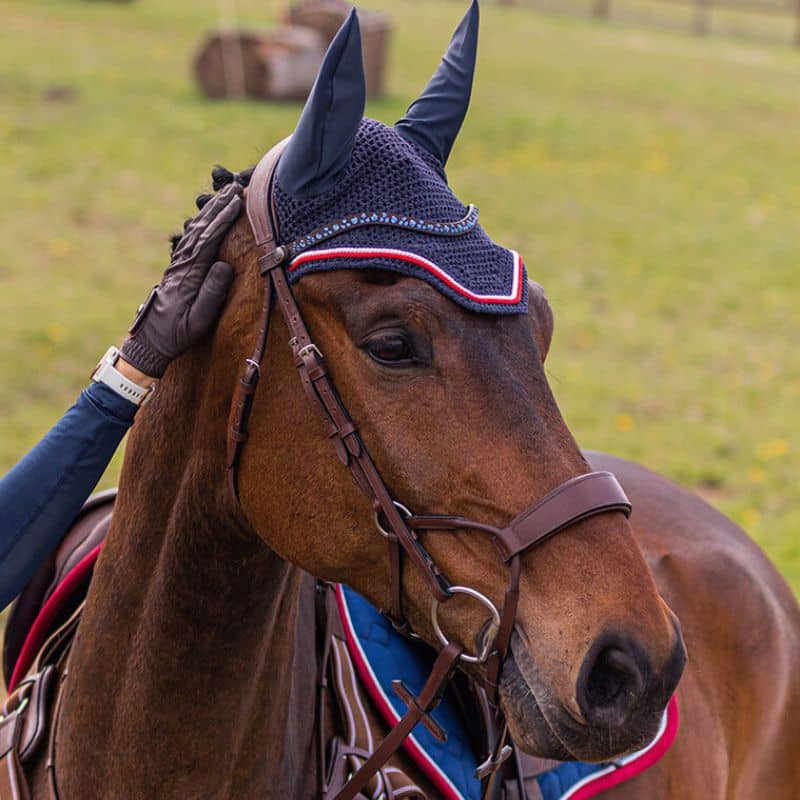 Le Bonnet Anti-Mouche Eldorado QHP Q-Cross est un bonnet crochet pour chevaux et poneys aux oreilles en lycra.
