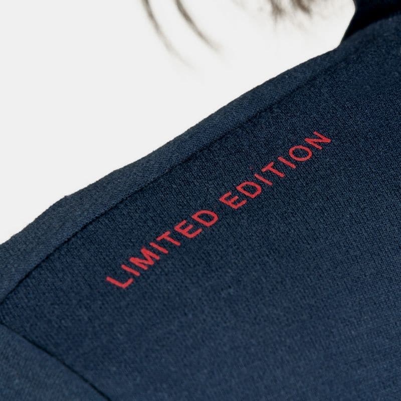 Ecusson tissé brodé sur épaule droite. Poignets et hanches bord-côte ton-sur-ton, finition fines rayures tricolores.
