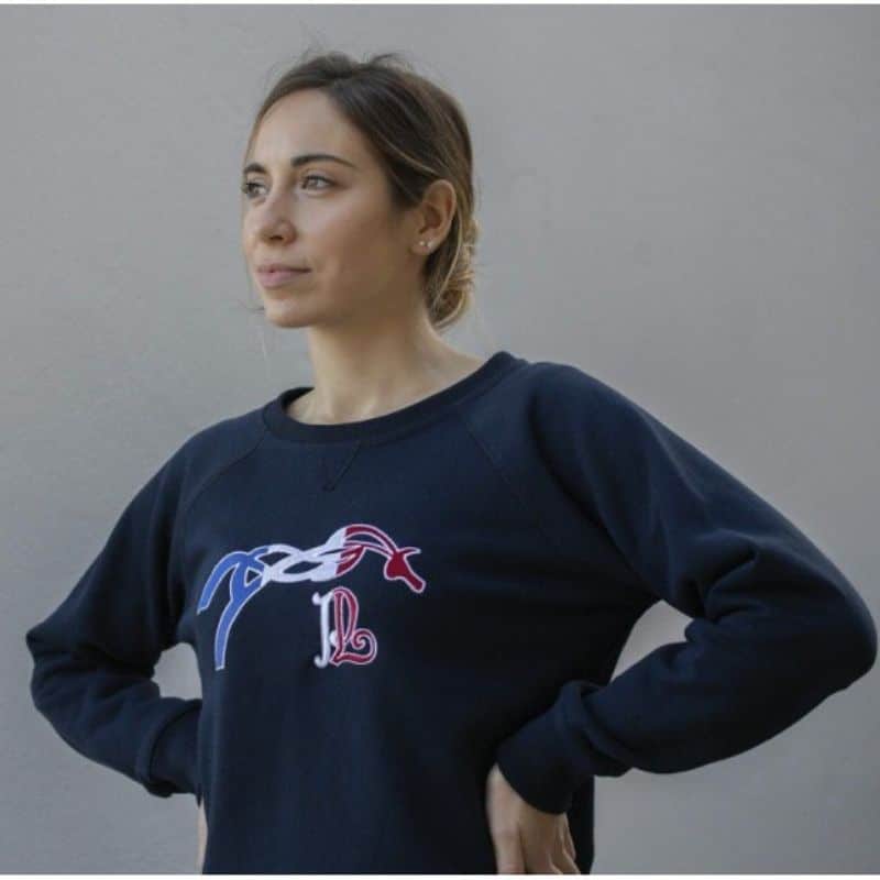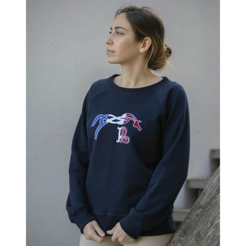 Un sweat shirt à col rond bleu marine, avec le logo Pénélope brodé en bleu blanc rouge à l’avant.