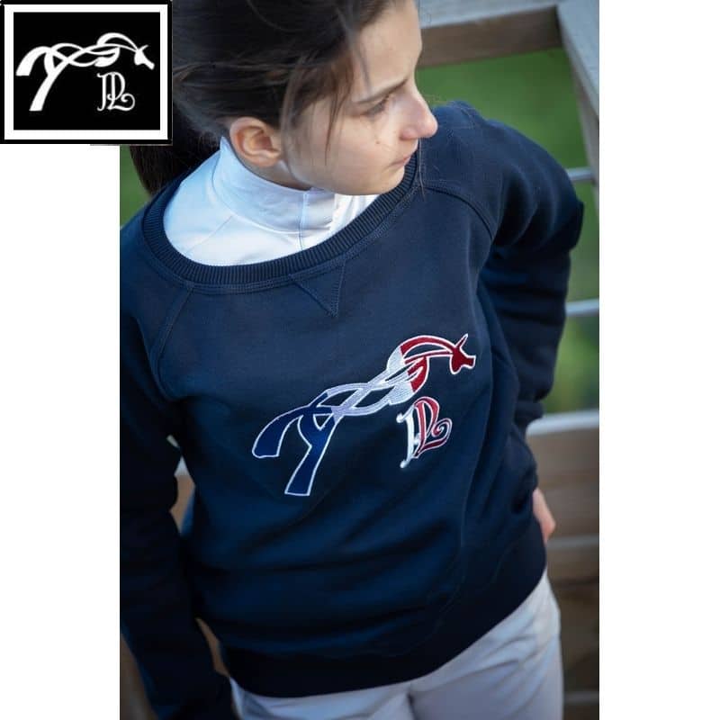 Un sweat shirt à col rond bleu marine, avec le logo Pénélope brodé en bleu blanc rouge à l’avant.