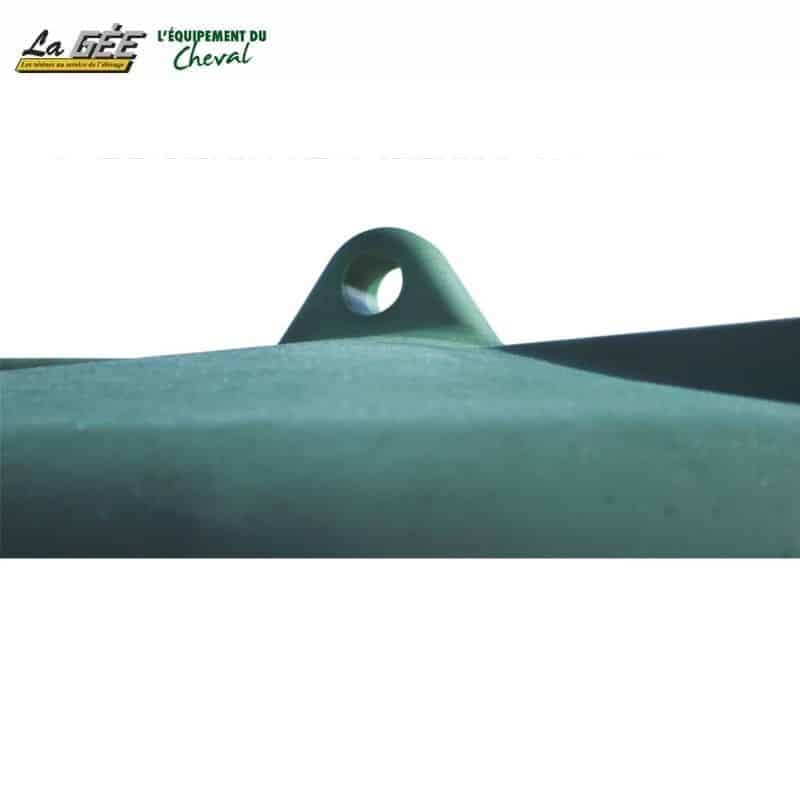 Lors du remplissage des RPE avec fond, la cloche est soulevée et le fond reste au sol. Ils sont percés de 6 trous de fixations permettant l’ancrage au sol du râtelier par des pitons et évitant son déplacement lors de l’alimentation des animaux. Leurs parties supérieures sont équipées d’un anneau de levage de diamètre 40 mm et de formes de renfort. Les fonds et les passages sont prévus avec écoulement d’eau. Passage de tête renforcé par un rebord en polyéthylène non blessant. Ils sont très sécurisants.