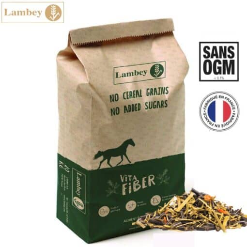 VITA FIBER LAMBEY est un aliment complet pour cheval et poney qui respecte les recommandations nutritionnelles des chevaux atteints de Cushing, Syndrome Métabolique Equin (SME), Fourbure ou Obésité.
