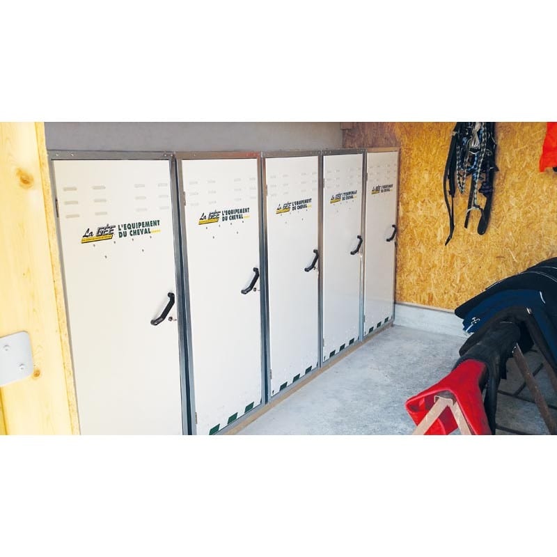 LA GEE – LA GEE – Armoire de Sellerie Grand Modèle est une armoire en acier galvanisé avec laquée pour une plus grande résistance dans le temps. Possibilité de ranger 2 selles d’obstacle.