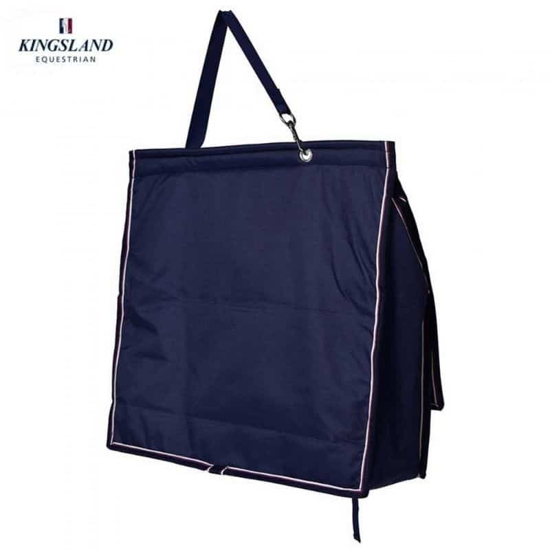 joliment bordé d’un liseret contrasté, en polyester, enduit PVC, facile à nettoyer, il se suspend à la porte du box pour les avoir à portée de main !