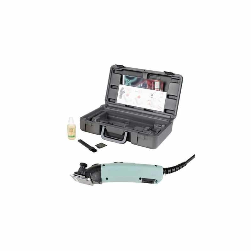 La tondeuse est livrée avec une mallette de transport, un jeu de peignes A2F (1,5 mm), un bidon d’huile, une brosse nettoyante, le guide d’utilisation et la garantie.
