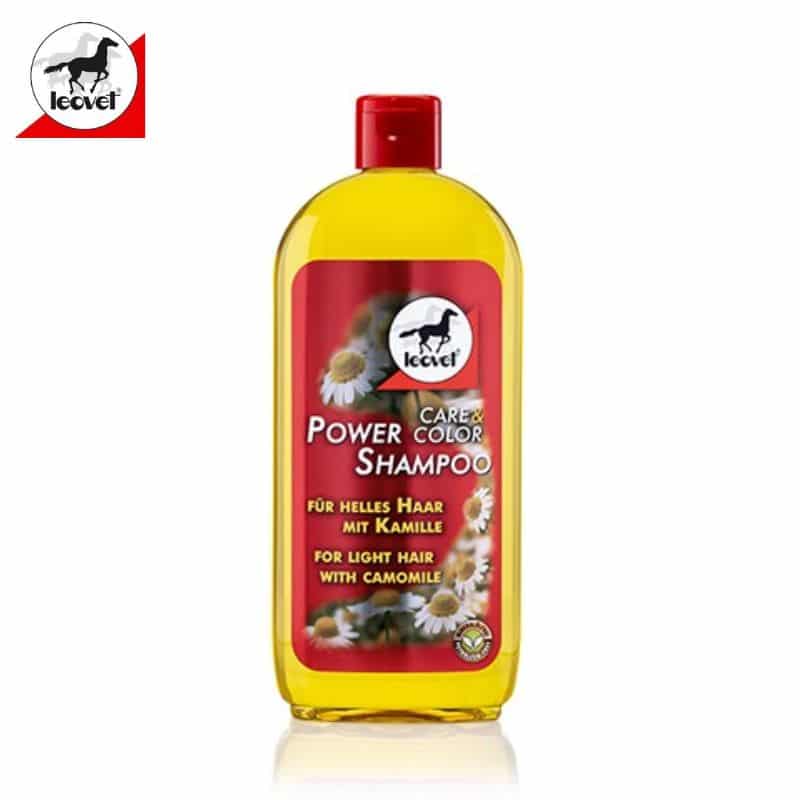 Pour les chevaux à robes claires ou alezan, le Shamping Power Camomille Leovet ravive la couleur naturelle des poils et crins.