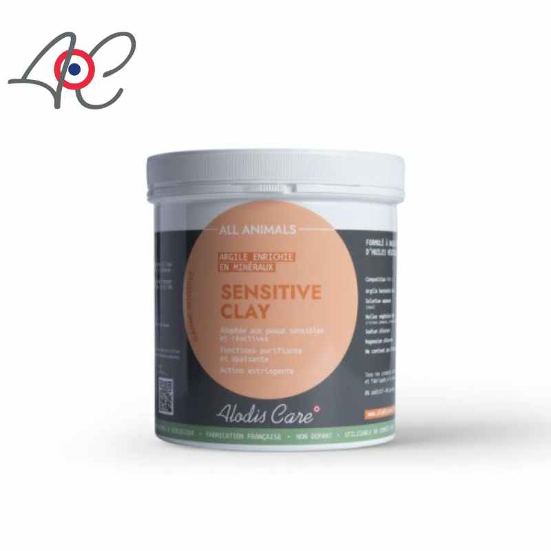 Sensitive Clay Alodis Care est une argile pour peaux sensibles qui ne contient aucunes huiles essentielles, est donc adaptée aux peaux sensibles et à tous les animaux (chevaux, chiens, chats…).
