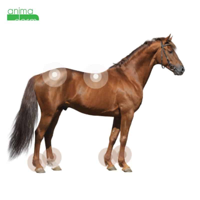• Si les membres du cheval sont en moyen état (croûtes fines, blanches ou peau dépilée) : 2 applications par semaine à même la peau en massant légèrement pour faire pénétrer.